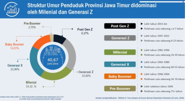 Menurutnya, mengenal karakteristik calon konsumen sangatlah penting. Lalu dicontohkan kondisi demografi Provinsi Jawa Timur saat ini. Dari 40,67 juta penduduk, ternyata yang berusia 8 tahun hingga 39 tahun sebanyak 50,12 persen. Ini bermakna struktur umur warga Jatim didominasi oleh generasi Z dan generasi milenial. Bila ditambah dengan generasi X (usia 40-55 tahun), maka jumlahnya menjadi 74,08%. Sebuah market yang sangat besar.